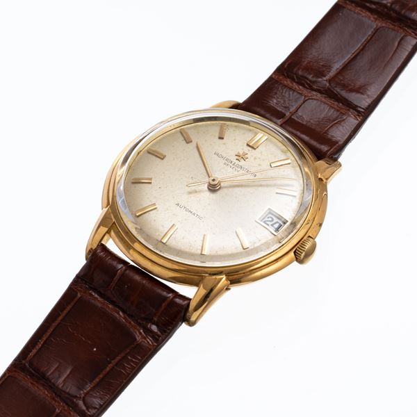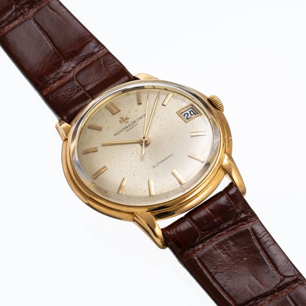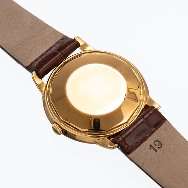 Notes: 18kt yellow gold self-winding timepiece, central seconds. Silver-tone dial, gold-plated hour markers and stick balls. Date display at three o'clock. Stepped case. Domed plexi glass. 18kt yellow gold screw back.