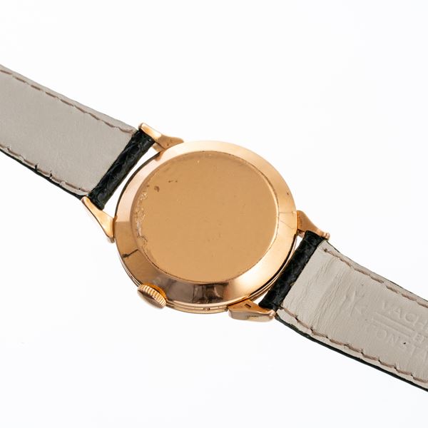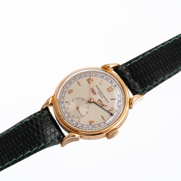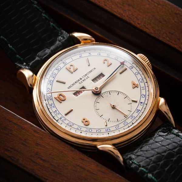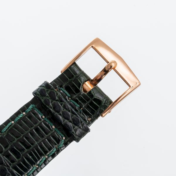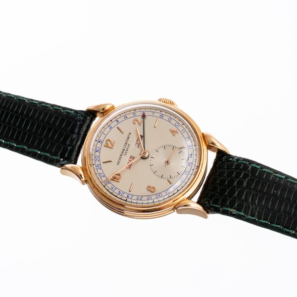 Notes: 18kt rose gold watch with stepped case and shaped lugs. Silver dial with double window at twelve o'clock, small seconds at six o'clock. Arabic indices at two hours. four, eight, ten and stick in 18kt rose gold, hands in 18kt rose gold. Blue anodized date sphere with red arrow. Date display with blue Arabic numerals. Calendar adjustment buttons at two and four o'clock. Leather strap, 18kt rose gold buckle. Domed plexi glass, 18kt rose gold crown and 18kt rose gold press-stud back.