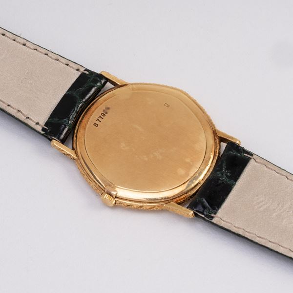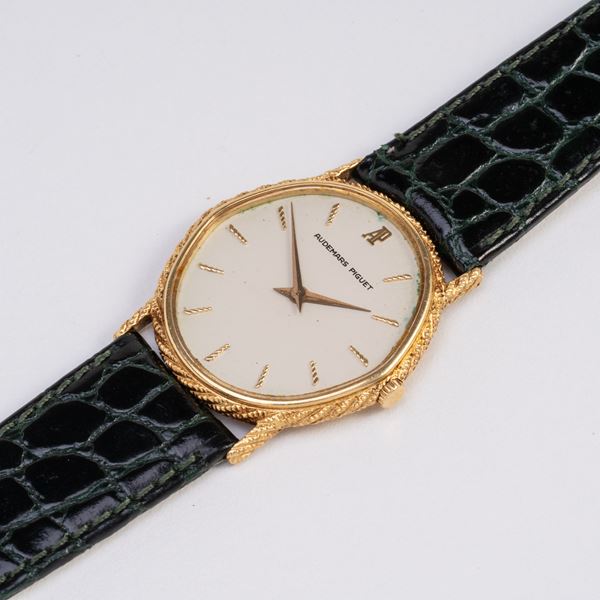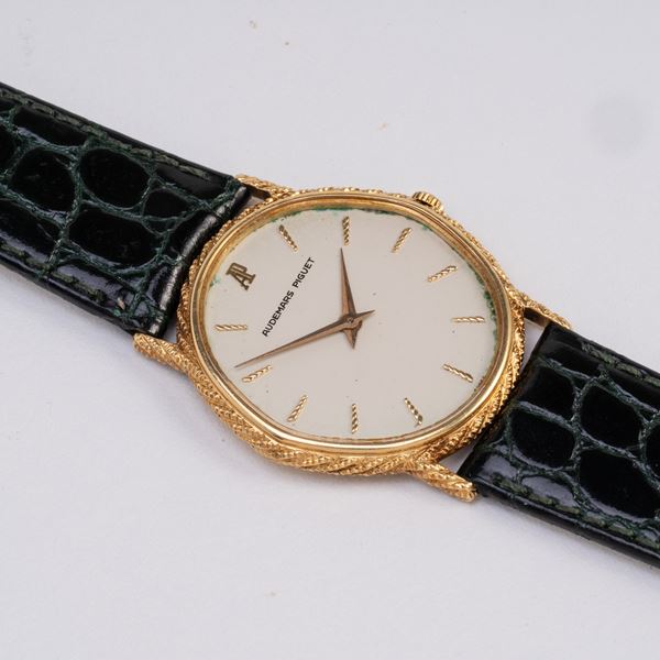 Note: Orologio solo tempo a carica manuale in oro giallo 18kt con ghiera lavorata. Quadrante bianco, indici lavorati e sfere daphine dorati. Cinturino in pelle, fibbia Audemars Piguet in oro giallo 18kt. Vetro minerale piatto. Fondello a pressione in oro giallo 18kt.