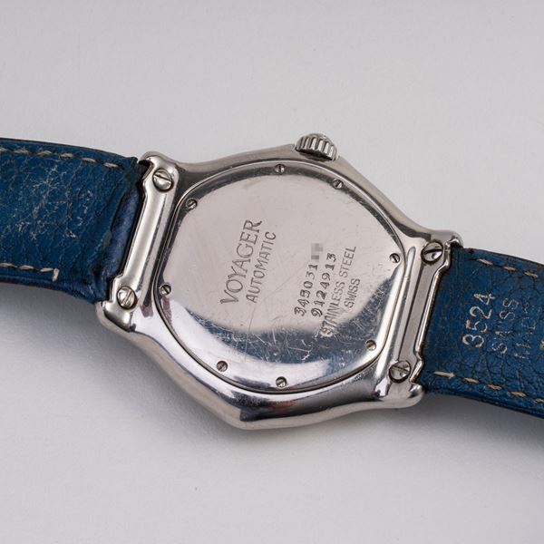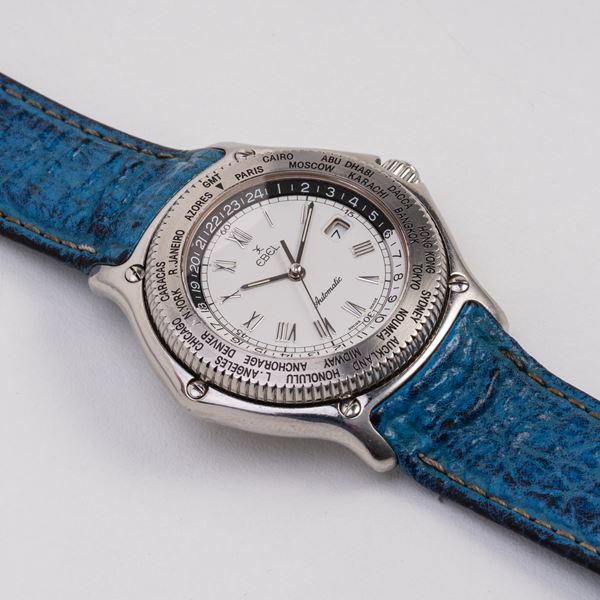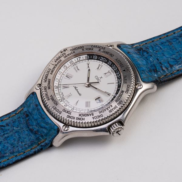 Notes: Automatic steel watch. White dial, date window at three o'clock. Silver Roman numerals with luminescent material. Stick hands with luminescent material. Bidirectional GMT bezel. Leather strap and Ebel steel folding clasp. Domed mineral crystal. Steel case back.