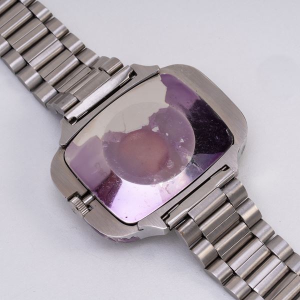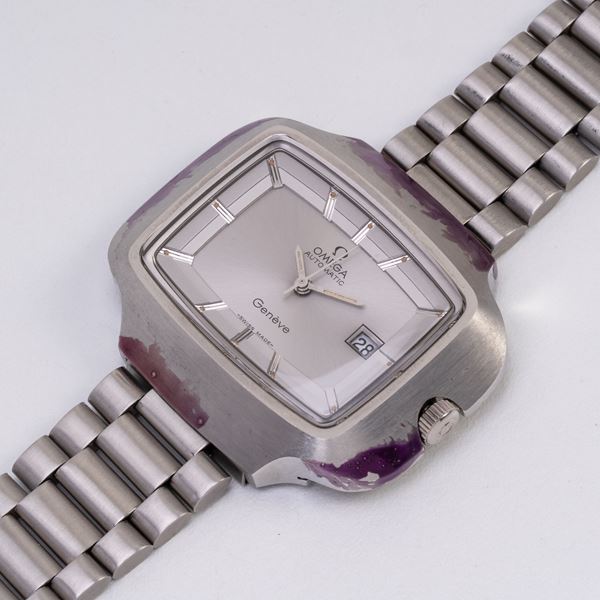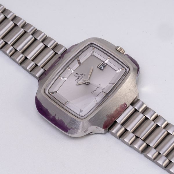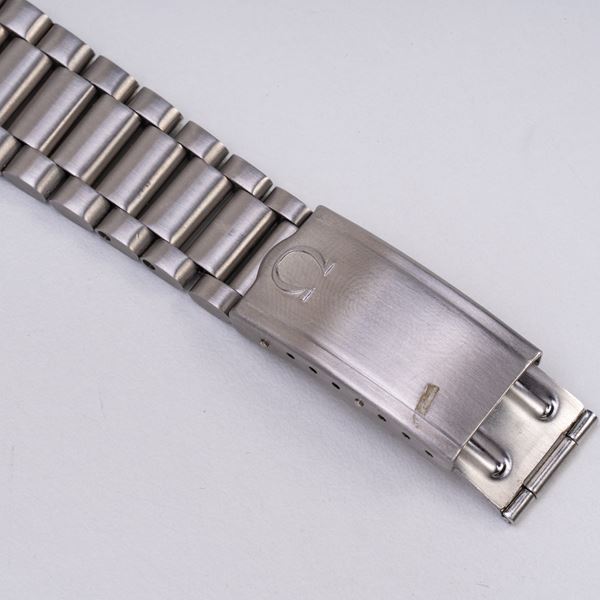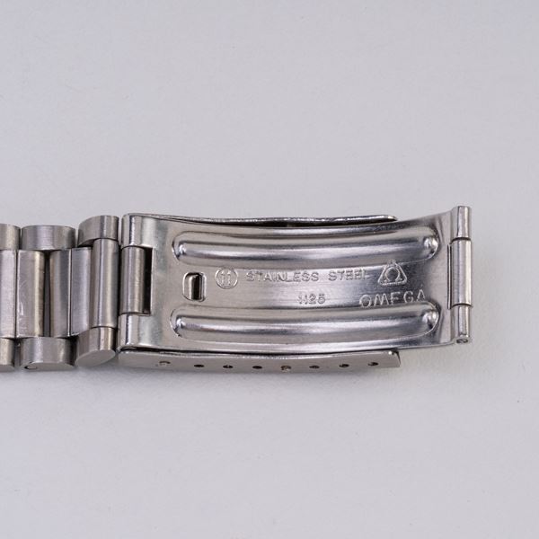 Notes: Automatic winding steel watch. Gray dial, date window at three o'clock. Luminescent baton hour markers and hands. Omega steel bracelet. Domed plexiglass crystal. Steel caseback.